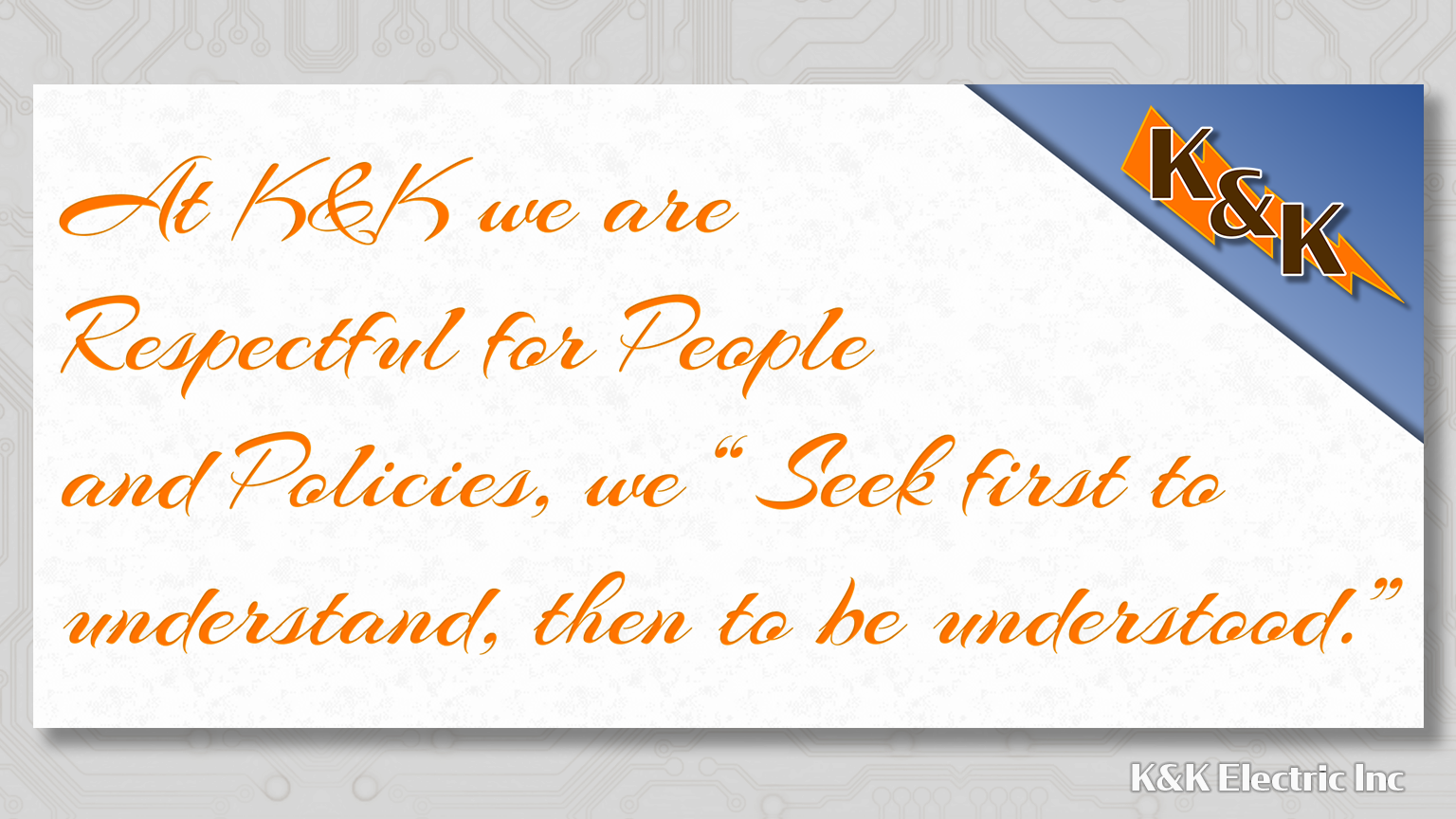 The following is K&K Electric’s list of Core Values and Behaviors that we as employees all strive to embrace and follow.