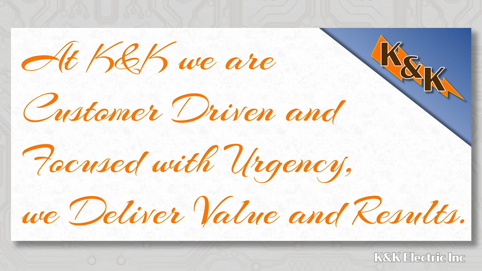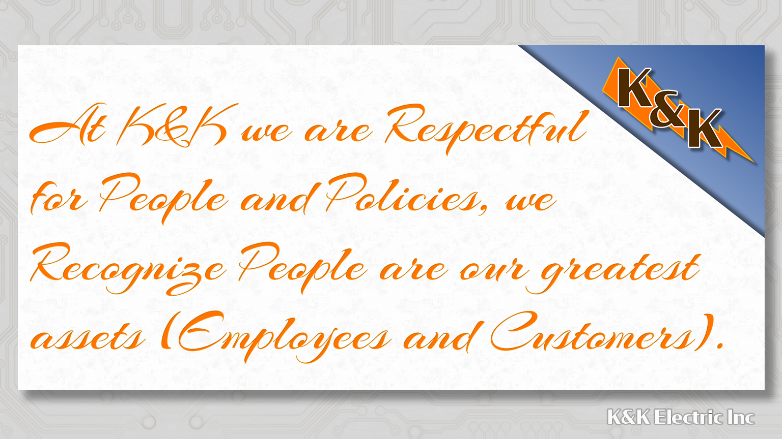 The following is K&K Electric’s list of Core Values and Behaviors that we as employees all strive to embrace and follow.